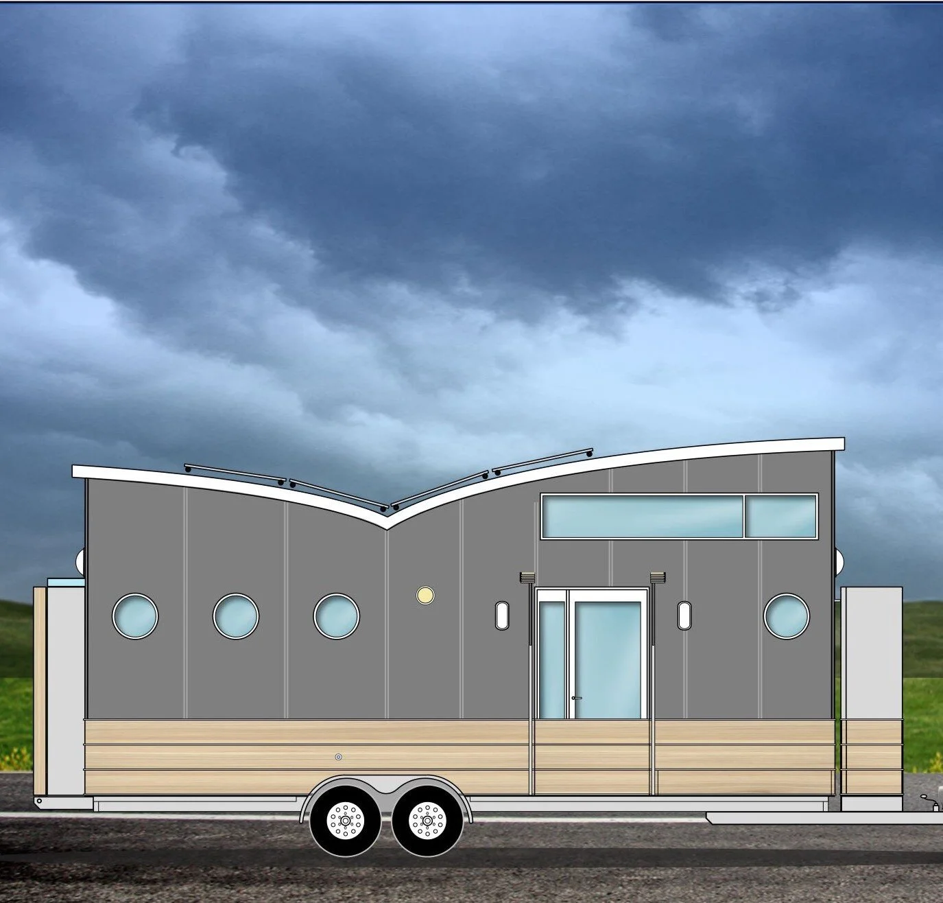 Tiny House on Wheels is a 200 sq. ft. structure built onto a 8’-4” x 24” Iron Eagle trailer. The total square footage including the loft is 275 sq. ft. Most structures of this genre invariably look like backyard garden sheds, hooked to a pickup, traveling down a given road. Desiring to avoid that look, this solution employs good design, conventional wood frame construction, curvable metal track roof and interior wood finishes.